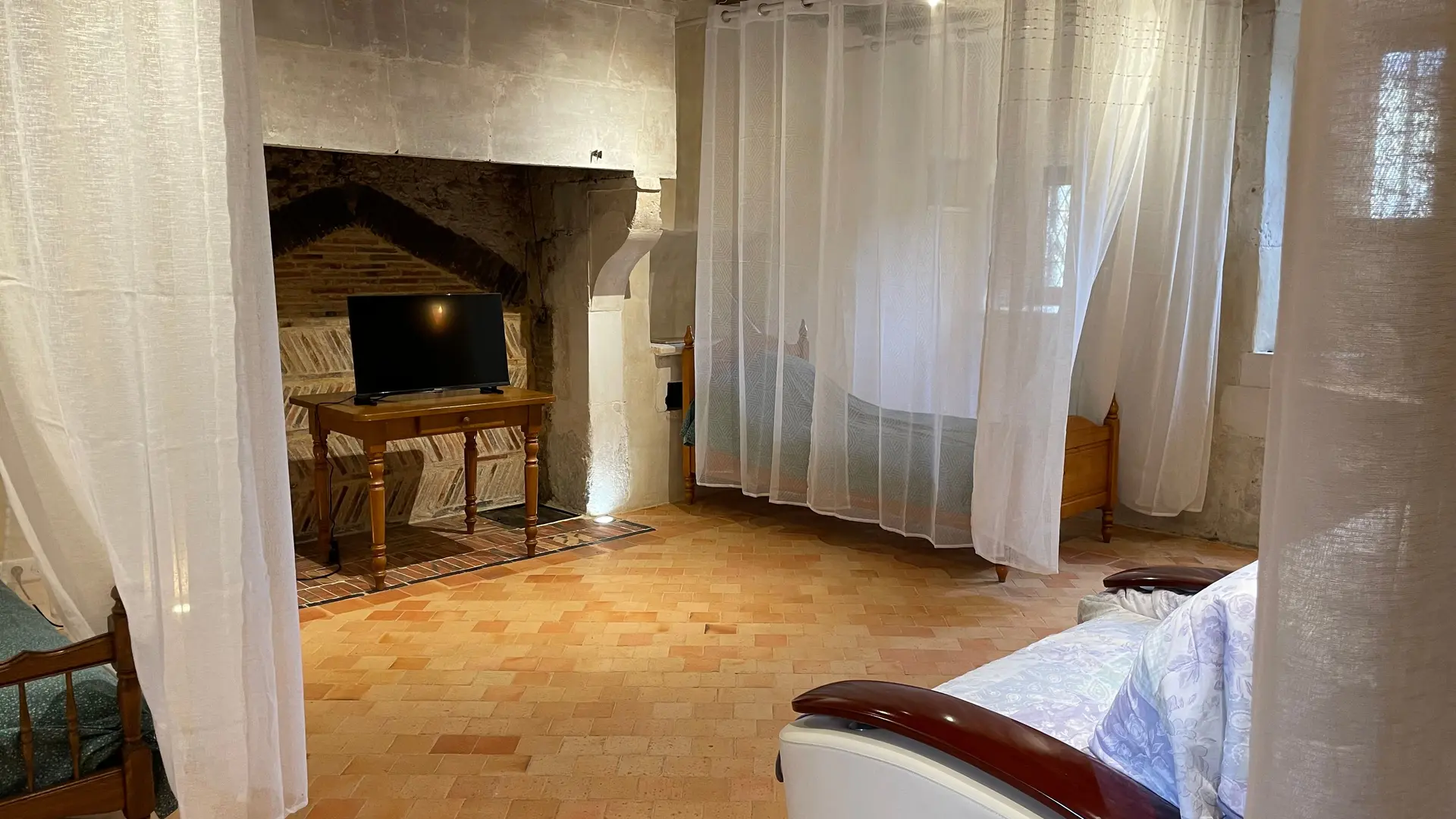 A votre disposition, 1 chambre d'hôtes en RDC pour 4 pers avec 1 lit 140, 2 lits 90. Une salle d'eau privative à la chambre avec douche italienne, 1 vasque et 1 WC.
