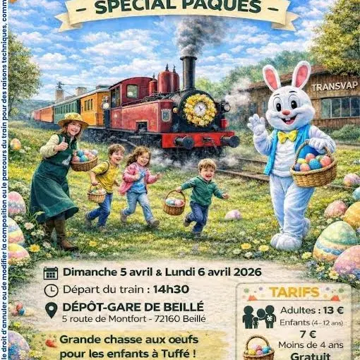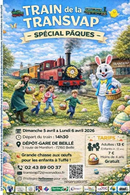 La transvap vous propose son traditionnel Train de Pâques. Réservation OBLIGATOIRE car c'est une journée très plébiscitée. "De drôles d'animaux se sont invités à la Transvap pour la chasse aux oeufs...et ce pour le grand plaisir du lapin farceur.